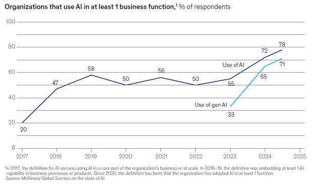 Figure 2: Sudden Surge in Use of AI by Organizations (Source: Mc Kinsey & Co.)
