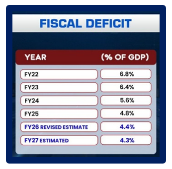 Fiscal Discipline Maintained: Fiscal deficit continues to narrow, FY27 estimated at 4.3% of GDP. FY27 Divestment Target At Rs 80,000 Cr Vs Rs 33,837 Cr FY26.